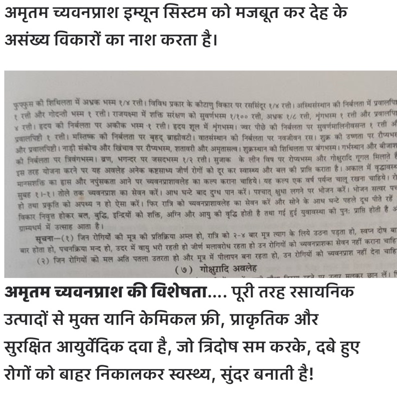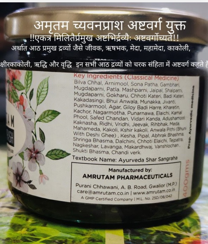 - अमृतम च्यवनप्राश आयुर्वेद की 5000 वर्ष पुरानी विधि से निर्मित किया है। इसमें किसी भी प्रकार का एक्सट्रेक्ट नहीं मिला है और स्वाद भी देशी दवा जैसा है!