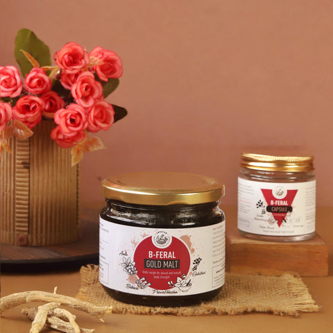 เคเคฏुเคฐ्เคตेเคฆ เคे เคถिเคฒाเคीเคค, เค เคถ्เคตเคंเคงा, เคถเคคाเคตเคฐ, เคธเคซेเคฆ เคฎूเคธเคฒी, เคคाเคฒ เคฎเคाเคจा เคเคฆि เคเคทเคงिเคฏों เคे เคธाเคฅ เค เคฎृเคคเคฎ เคा B Feral Gold Malt เคเคฐ Capsule เคเคชเคे เคीเคตเคจ เคो เคจเค เคเคฐ्เคा เคเคฐ เคเคค्เคฎเคตिเคถ्เคตाเคธ เคธे เคญเคฐ เคธเคเคคे เคนैं।