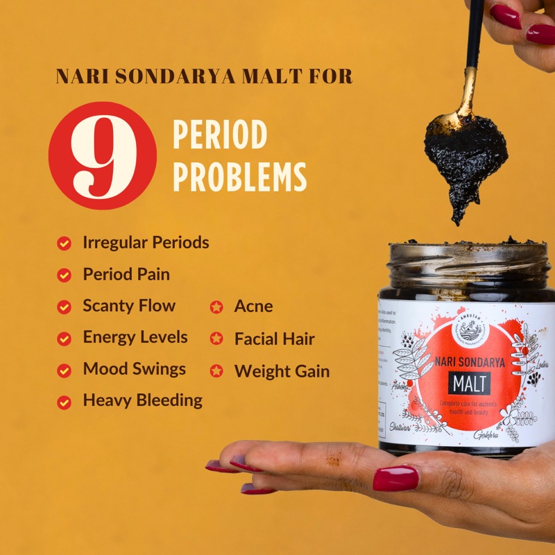 Amrutam Nari Sondarya Malt आयुर्वेदिक जड़ी-बूटियों से तैयार, नारी को PCOD/PCOS, हार्मोनल असंतुलन और मानसिक तनाव से राहत देता है।