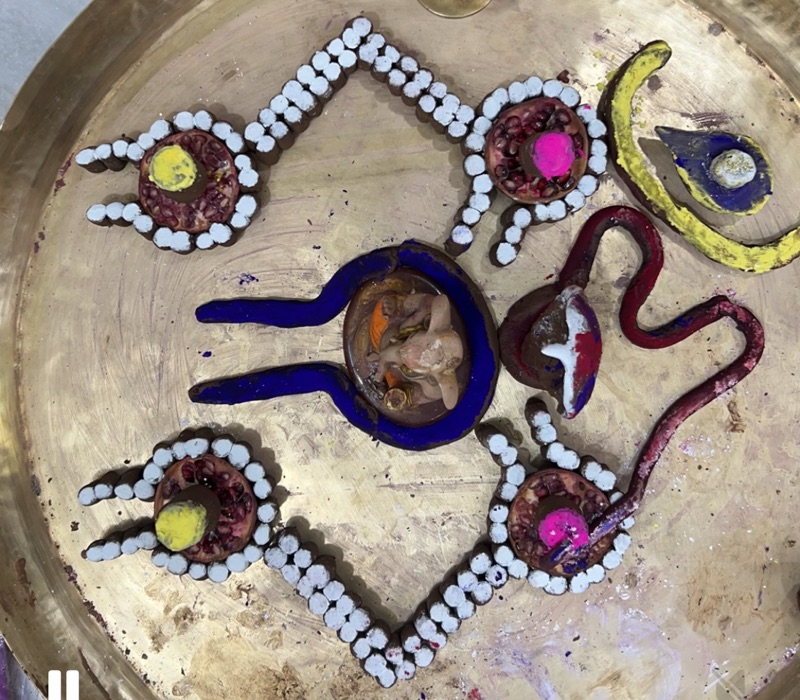 - मिट्टी लेकर बीच में छोटे-से गोले बना कर उसे सपाट कर ॐ का आकार बनायें।