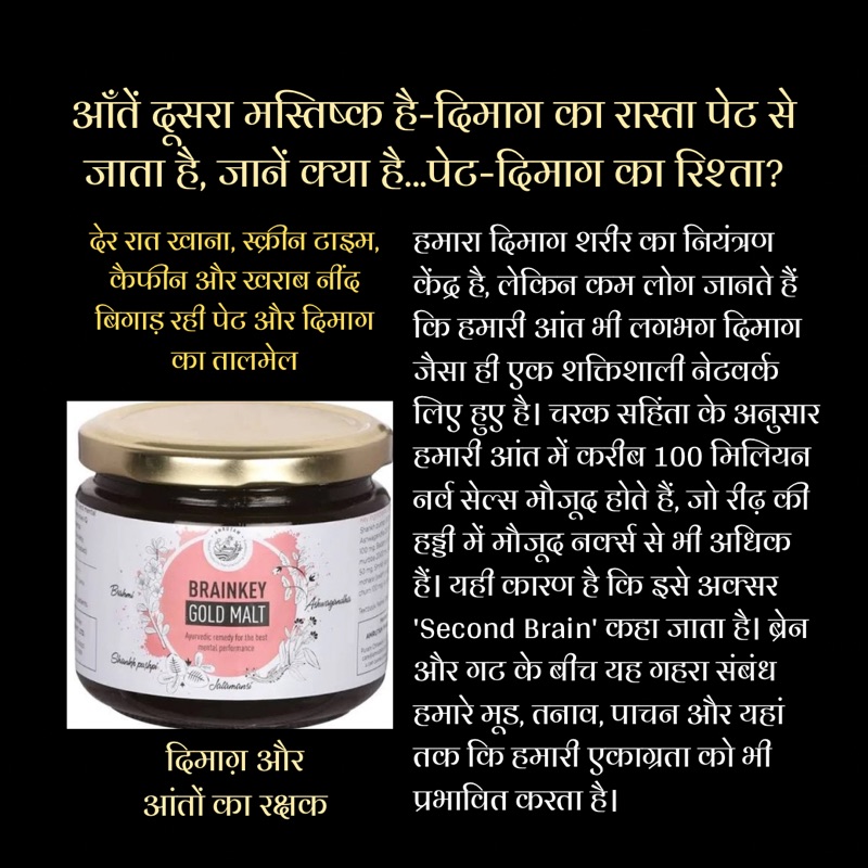 यही कारण है कि आयुर्वेद में पेट को मन का निवास-स्थान कहा गया है।पेट और दिमाग का वैज्ञानिक संबंध (Gut-Brain Axis)